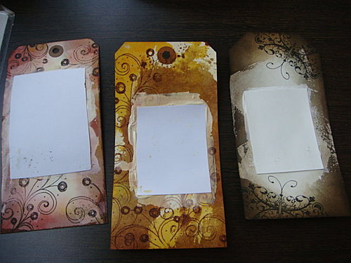 將刷好塑形膏和復古印台的TAG--中間在抺上一層厚厚地塑形膏.然後反面貼上蓋好圖的紙.